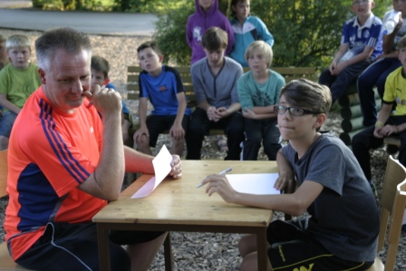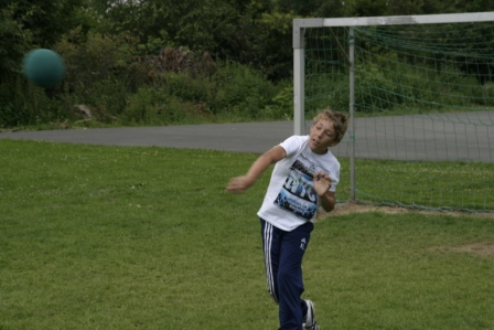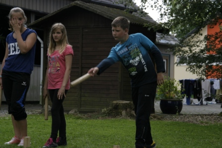 Am Mittwoch frühstückten wir, bevor wir ein großes Sportturnier veranstalteten. Es gab 8 Teams in 2 Gruppen. In den Disziplinen Fußball, Volleyball, Kubb und Völkerball traten sie gegeneinander an. Nach den Gruppenspielen gab es noch die Finalspiele. Team5 gewann knapp im Elfmeterschießen. Zwischendurch aßen wir unsere Lunchpakete. Nach dem Turnier hatten wir bis zum Abendessen Freizeit. Danach startete das Spiel: Schlag den Betreuer! Es war so aufgebaut wie Schlag den Raab! Leider verloren die Kinder das Spiel, weil der Betreuer Peter das entscheidende Spiel: Buchstabieren rückwärts gewann. Nach dem Spiel gab es, dank der guten Stimmung und den Anfeuerungsrufen der Kinder, für jeden Wassereis. Insgesamt war es ein schöner, aber auch anstrengender Tag!